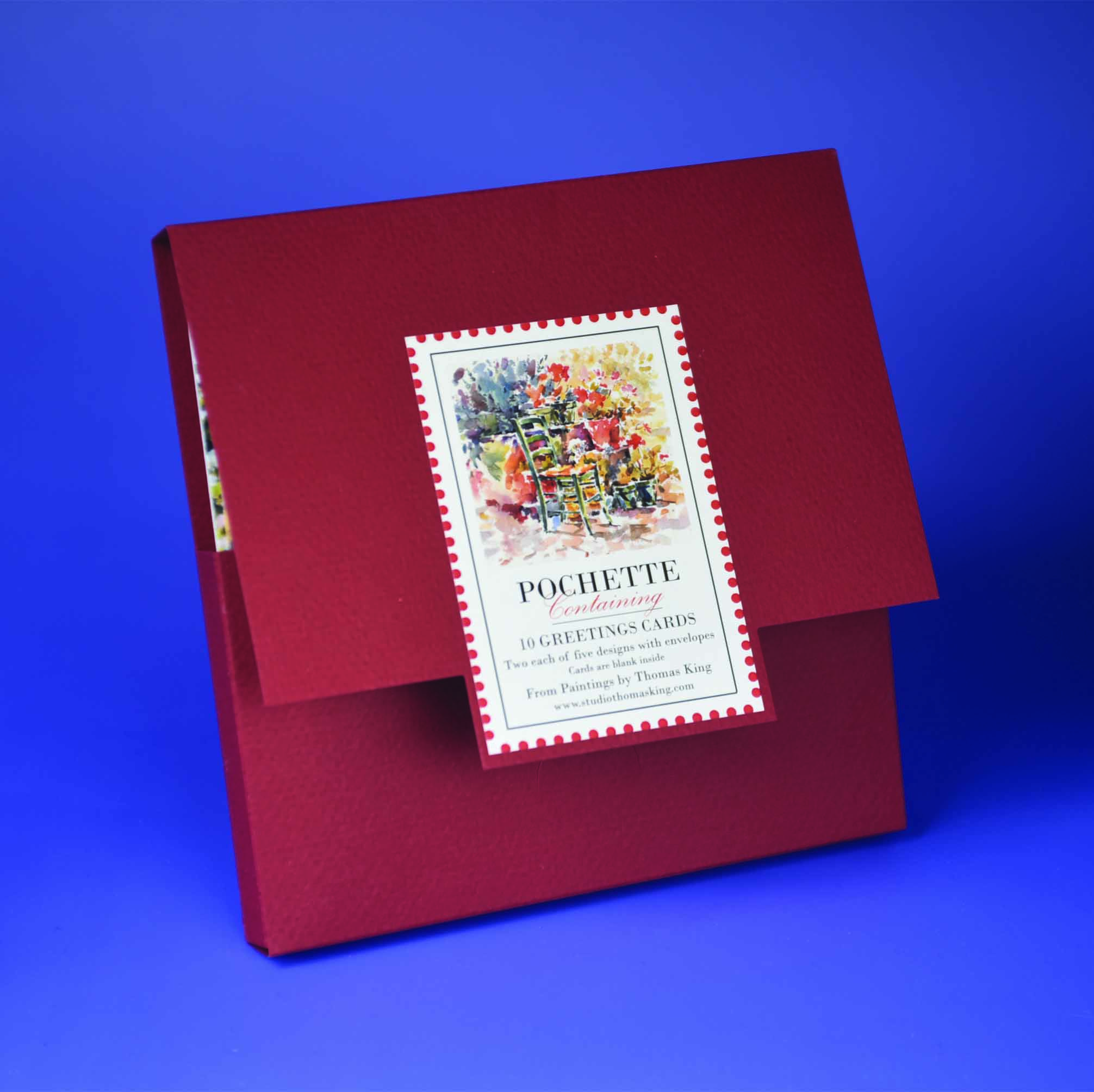 Pochette, from the French meaning pocket or purse. This Red Pochette contains ten greetings cards (2 x 5 images) featuring images of paintings by the artist Thomas King. The Pochettes are hand assembled and made from 210g hammer finish, self coloured, matt card. The greetings cards measure 148mm x 148mm (folded size) and are printed on 350g silk finish card. The cards are blank inside for your message and include envelopes. This is an attractive product for personal use or as a gift and is a unique design to the studio. All of the paintings featured on the front of the cards were painted on location directly from the subject. Their titles include: The Orchard in Spring, Summer Display, Hidden in the Reeds, The Suntrap and Blackberry and Briar.